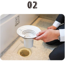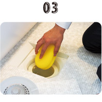 排水栓と排水口部のゴミや髪の毛を歯ブラシや綿棒で取り除き、排水口部の汚れをスポンジで落とします。