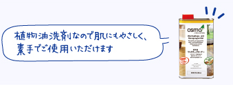 無垢床のお手入れには「OSMO ウォッシュ&ケアー」がおすすめ。しつこい汚れをしっかりと落とし、油分を補ってくれます。使い続けることで汚れがつきにくくなり、床の滑りも軽減してくれる優れものです。